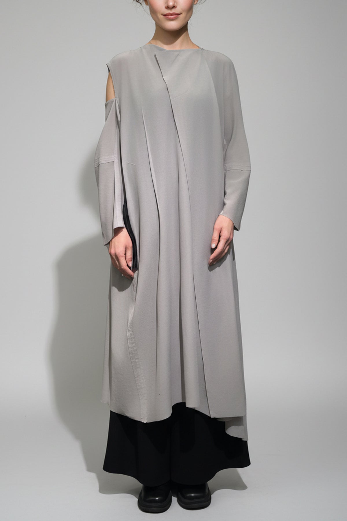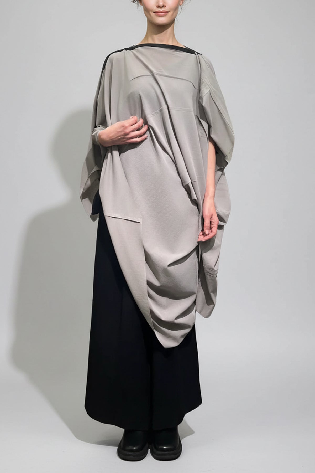 ワンピースであり、横に着ると変形チュニックになる2WAYドレス。気分やオケージョンによって着方を変えられるひとつで2着分の服です。