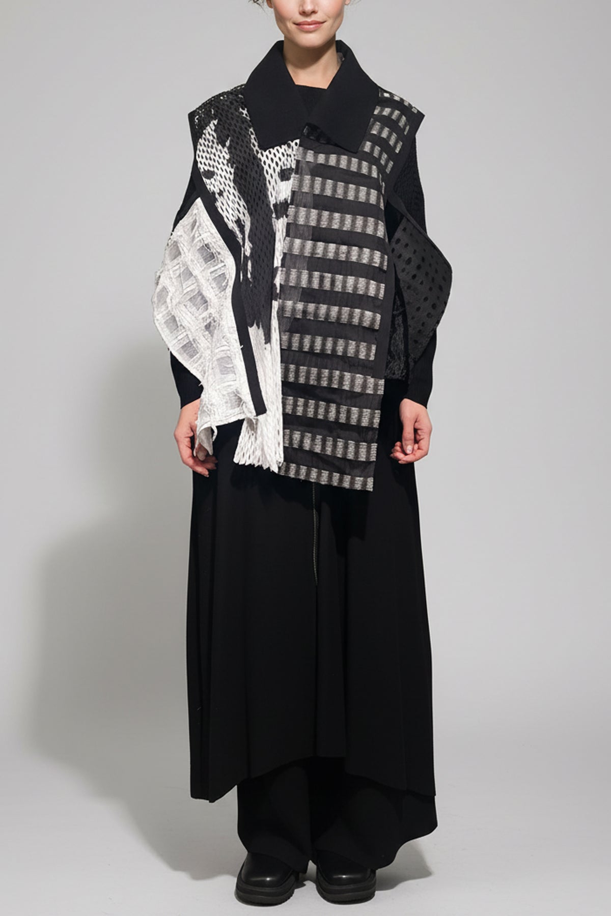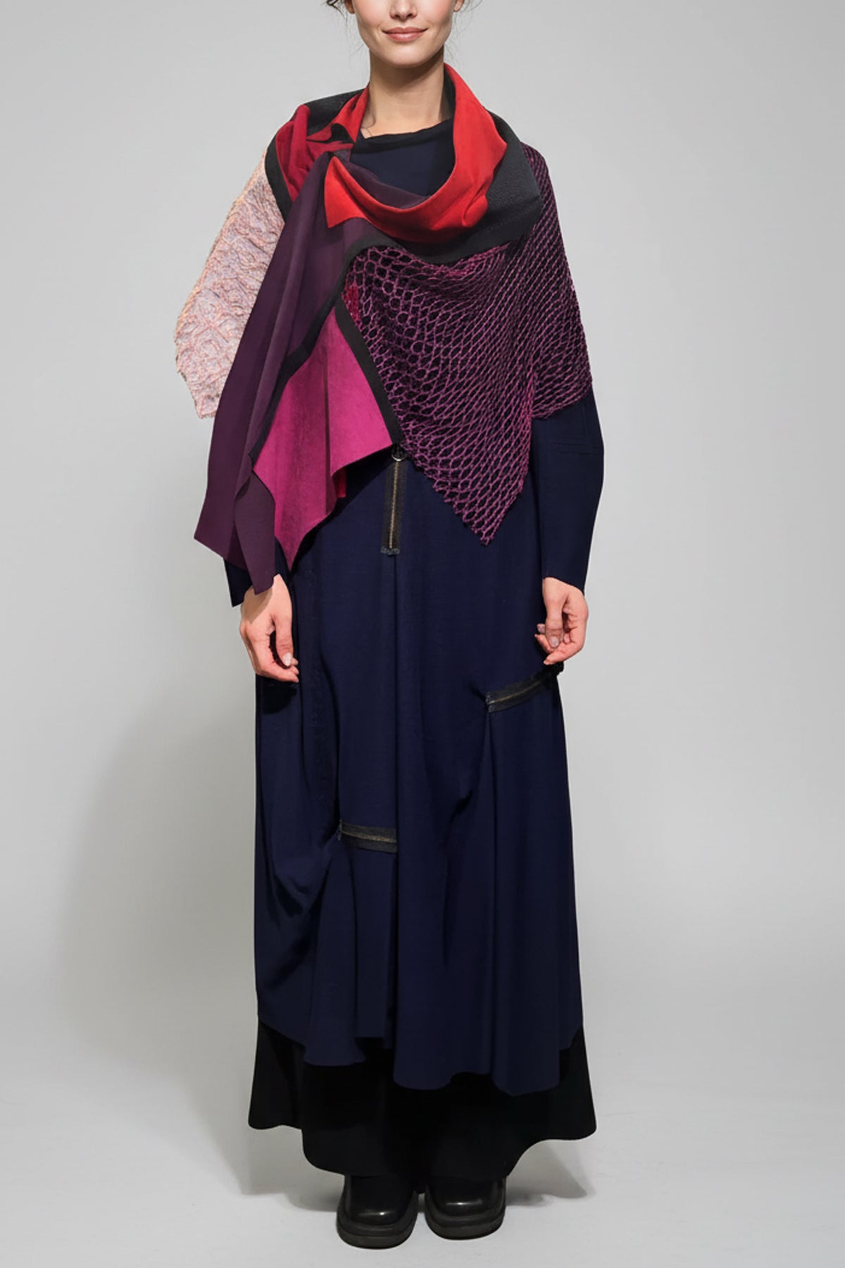 纏えるアクセサリー。衿があり前にスナップがひとつ。首に巻くとストールに、腰に巻くとスカートにも。シンプルな服に1枚羽織るだけで華やかにオシャレになる便利なアイテムです。たたむとA4サイズとコンパクトなので旅行にもオススメです。コートの上に着ることもできます。