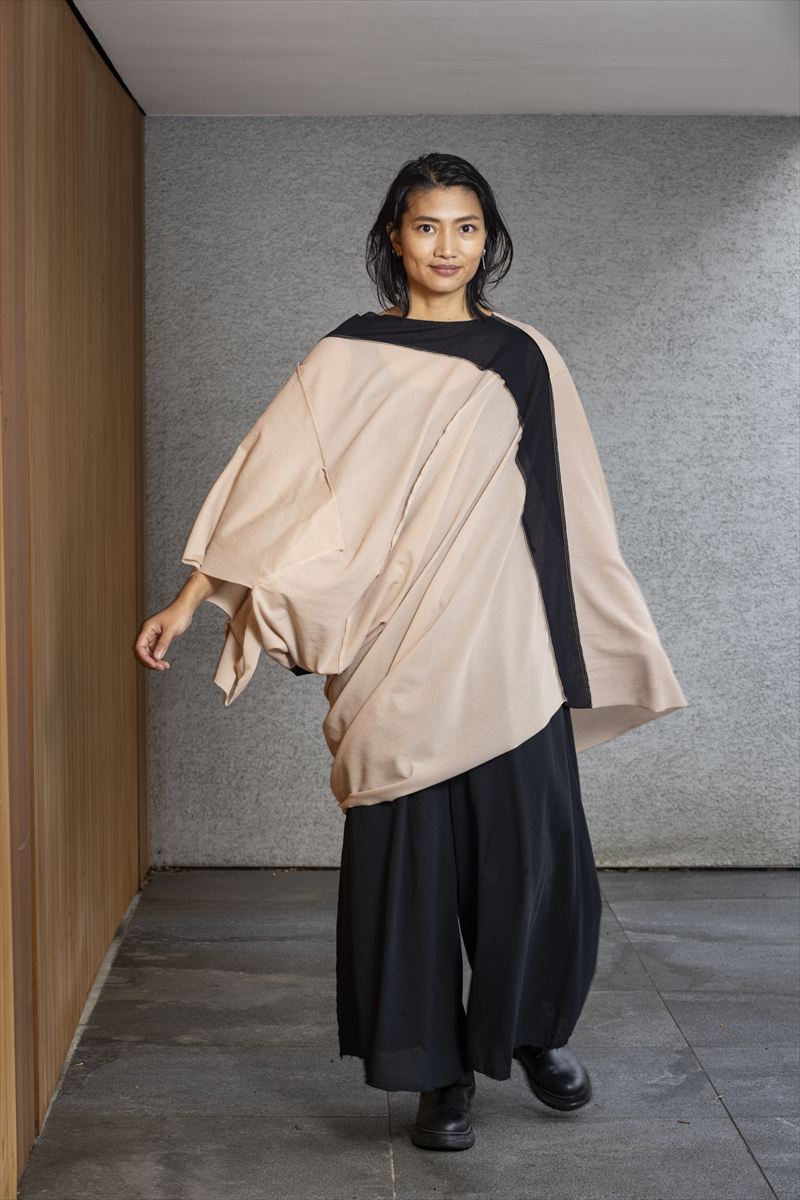 パーツで遊べたり、カタチが変わったり、軽く伸びる素材のミハイルギニスアオヤマのワンピースは旅行にも便利。