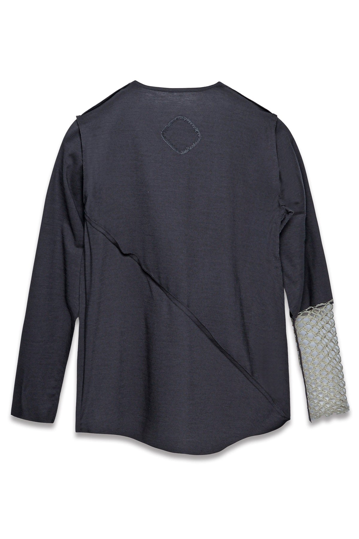 右袖が一部レース素材のVネックトップス。ブラックはレースもブラックになります。