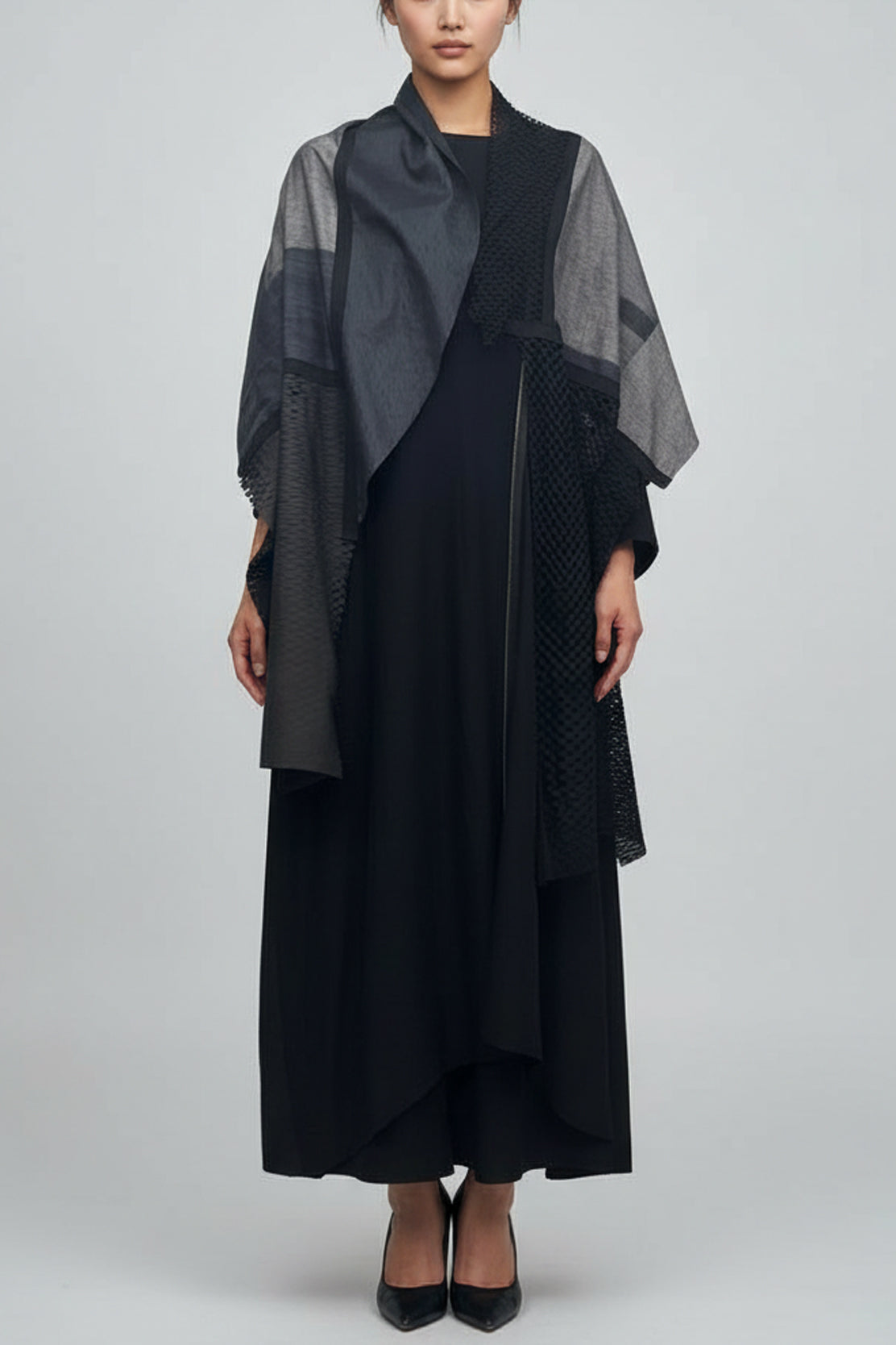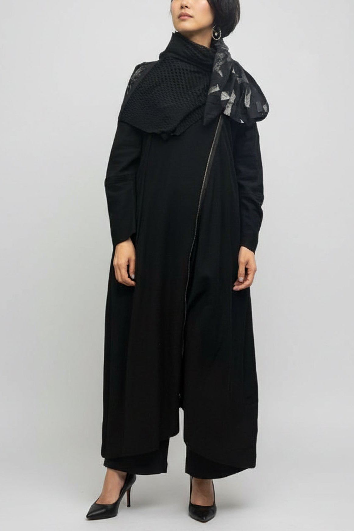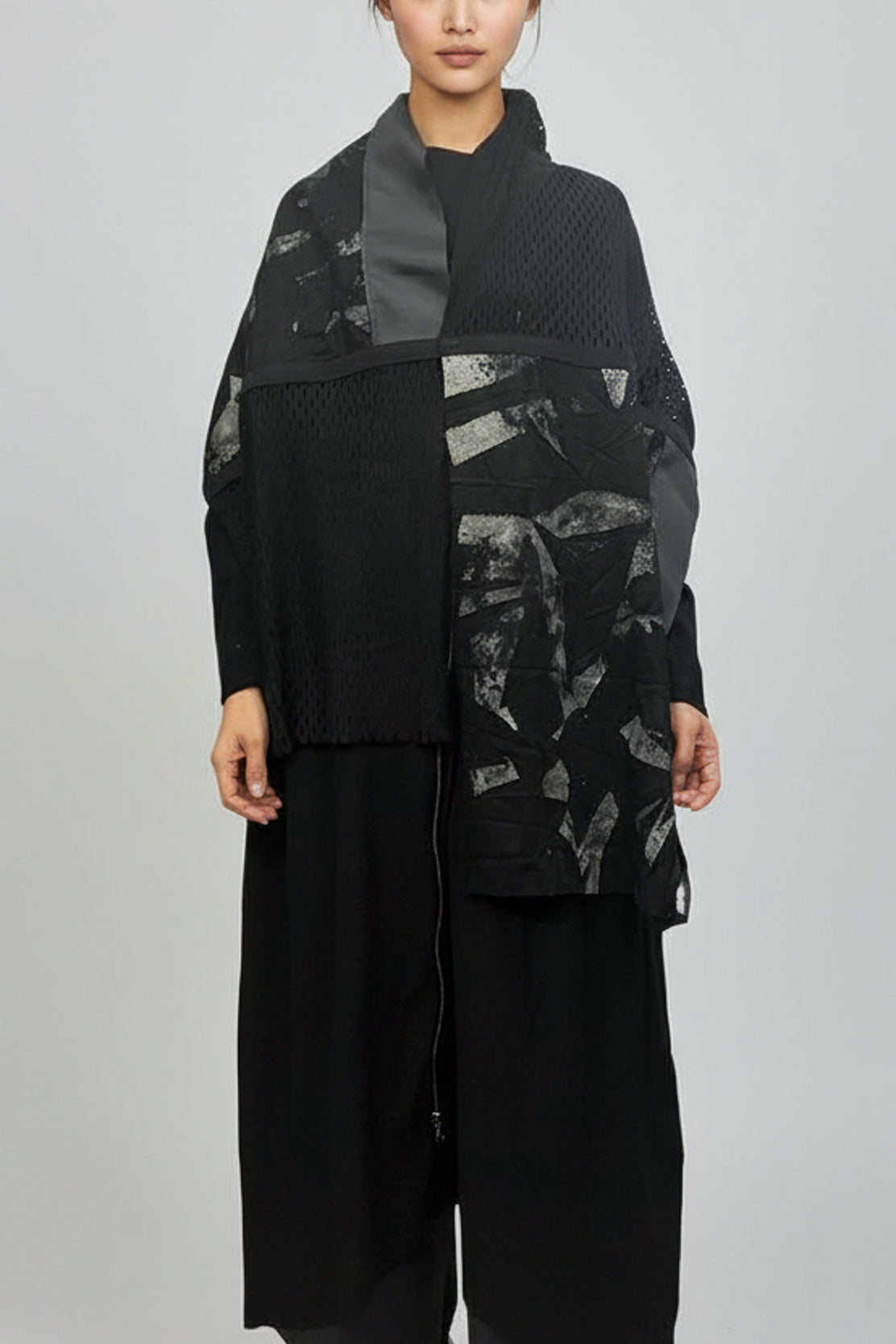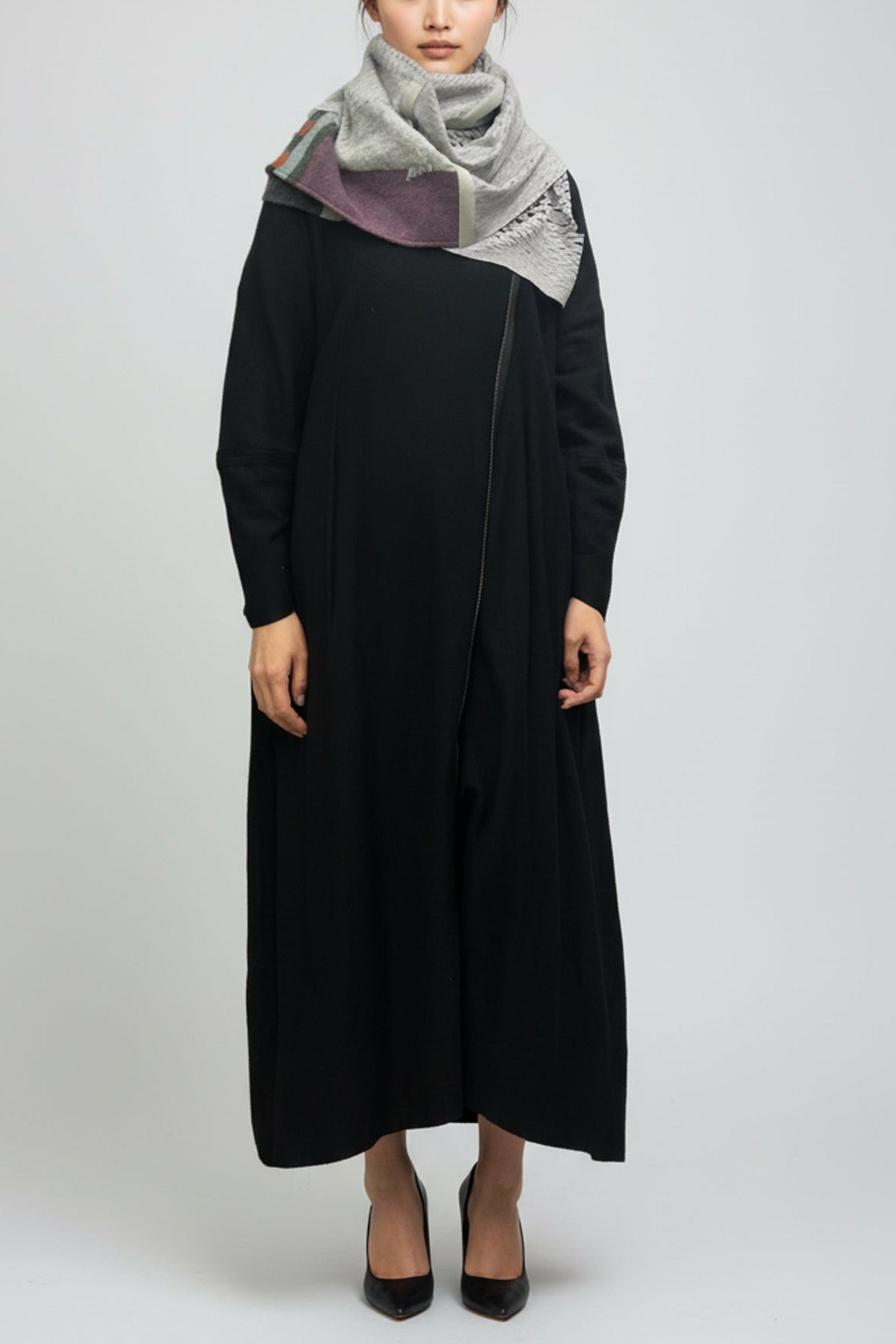 富士山の麓で織るやわらかなウールを下地にミハイルギニスが布でデザインしたオリジナルテキスタイルと軽量で伸びがありカットオフ(切りっぱなし)が可能な、暖かいウール素材の和歌山県産の次世代ニットの組み合わせです。