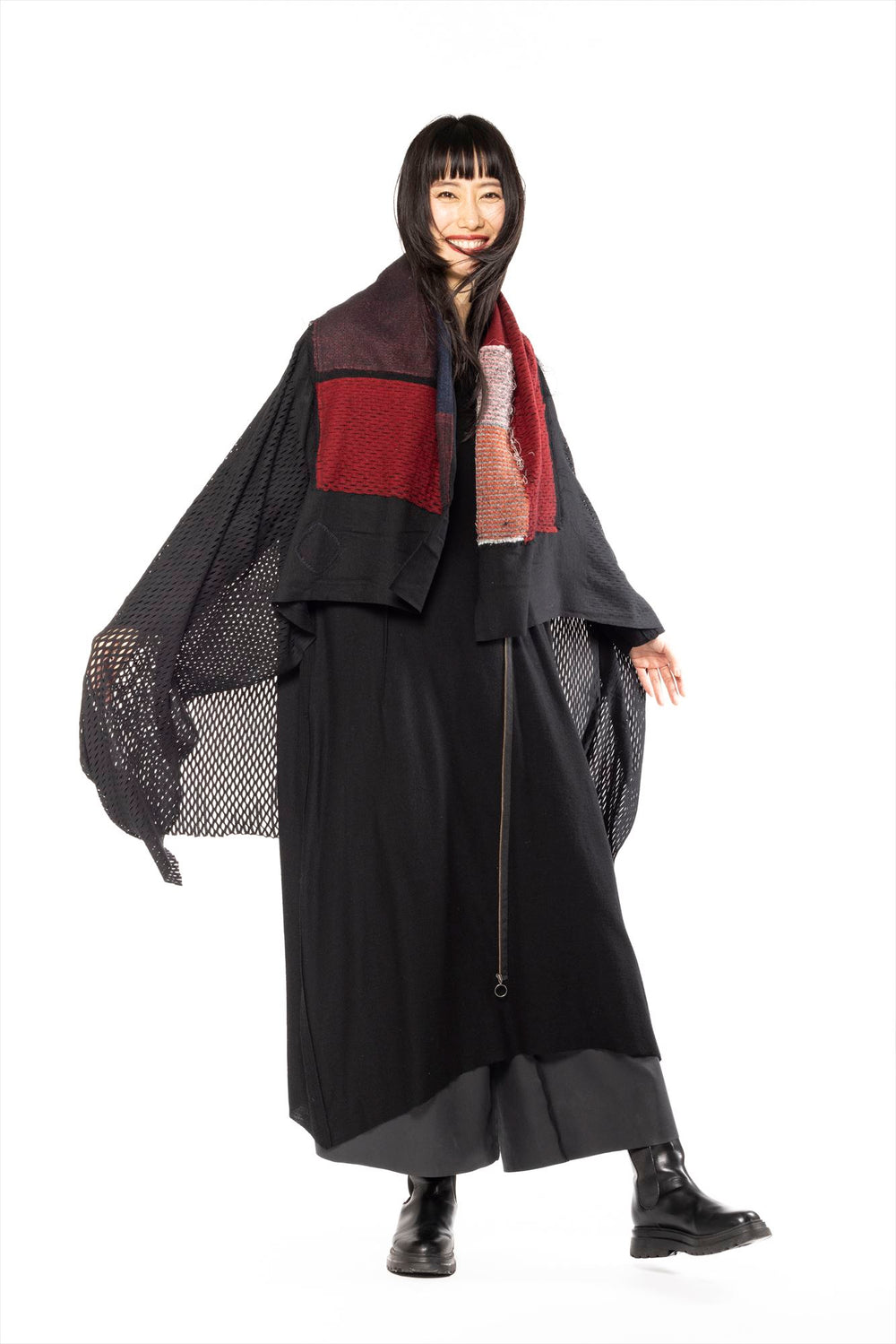 A wool version of the classic plain cornice stole. The cornice (bellows) section traps air, providing warmth while adding a rich color to your neck. MICHAIL GKINIS has patchworked fabrics, including those from NUNO WORKS—featured in museums worldwide—creating a design as if each piece were individually painted. When folded, it becomes compact to A4 size, making it a convenient item to carry in your bag.